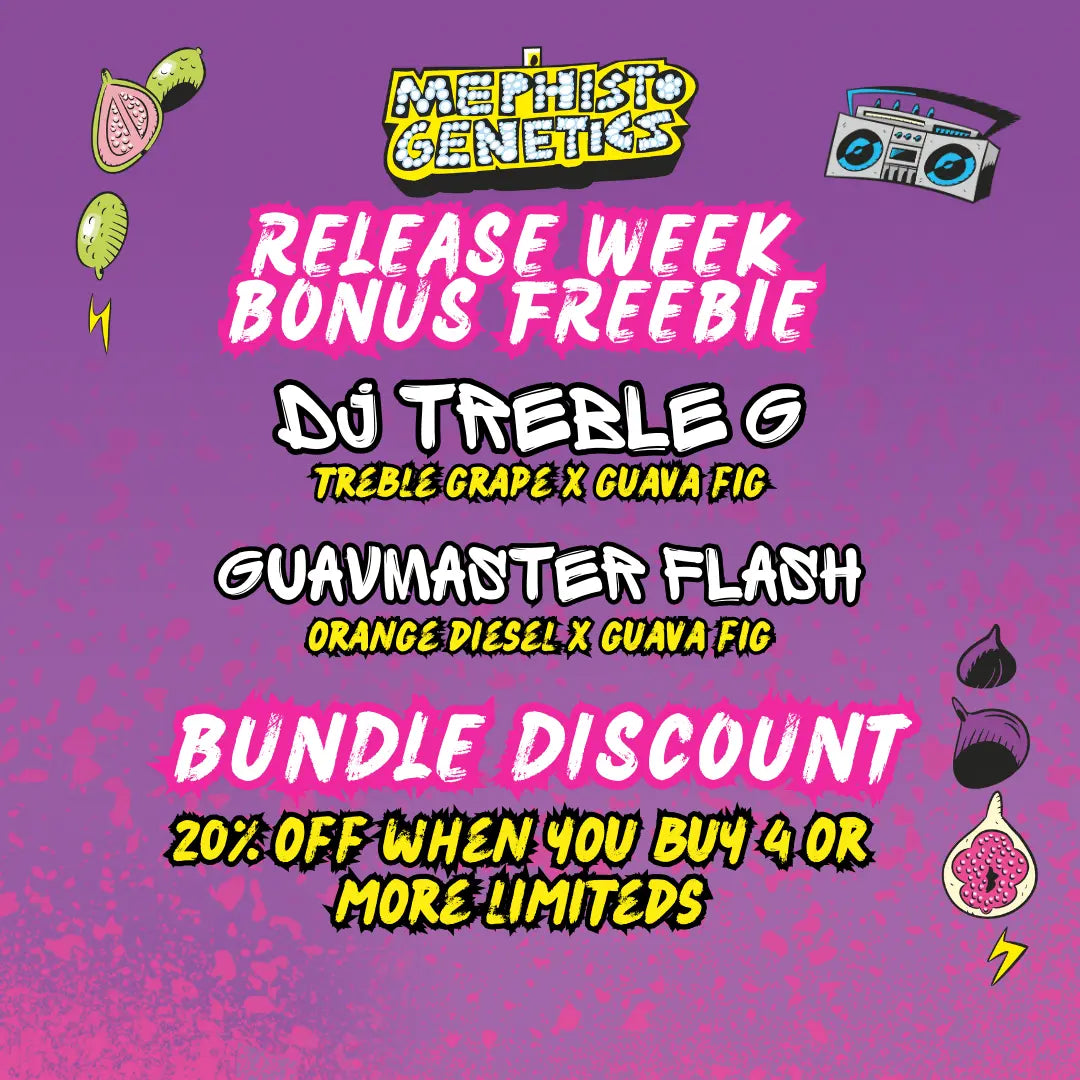 Get a free pack of either Guavmaster Flash or Dj Treble G with a purchase of a Guava Fig 3-seed pack or one of the new Limited Edition crosses, while stocks last.